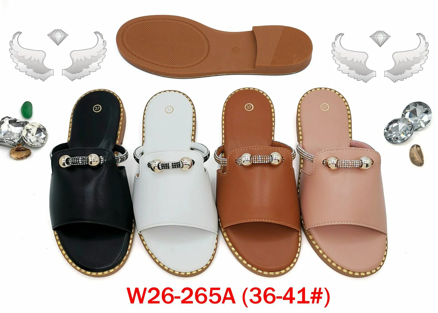 These glamorous slides feature a smooth, matte PU synthetic leather strap (in 4 versatile hues: black, white, warm brown, blush pink) adorned with a central decorative band — detailed with sparkling crystal accents and metallic hardware for a luxe touch. The footbed edge is finished with small gold-tone studs, adding subtle texture to the polished silhouette.