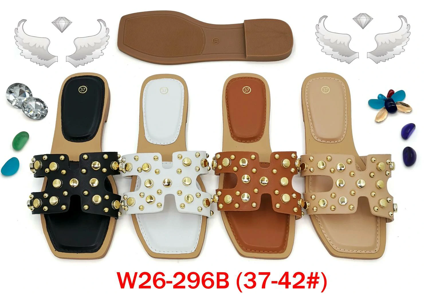 These statement slides feature an H-shaped strap silhouette (crafted from smooth, matte synthetic material) adorned with metallic stud embellishments (in gold tones) for a bold, textured look. The collection includes 4 versatile colorways: